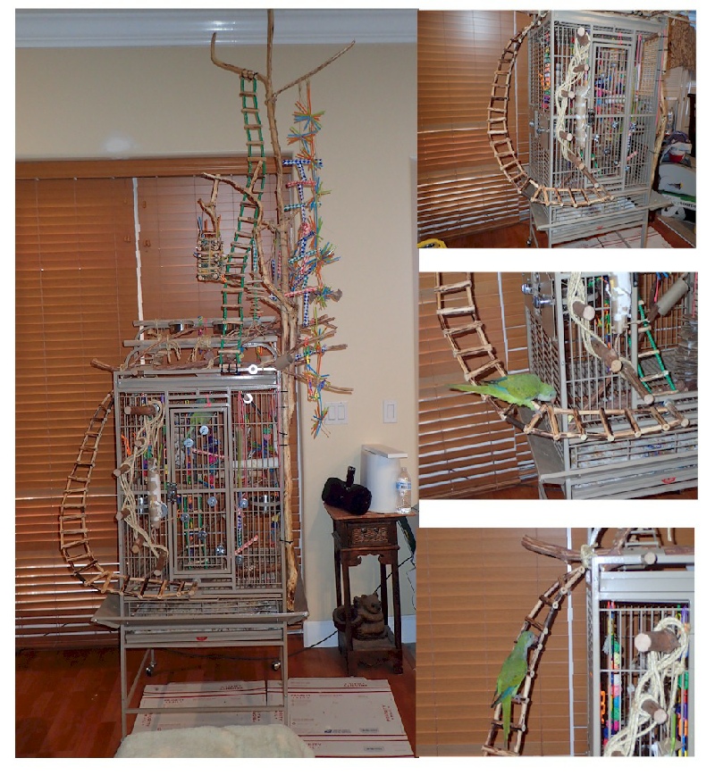 Created another Cage Project, with ladders, Forging Toys, Chew Toys, and Tower Perch 10 foot tall. all DIY hand made using free materials. my Parrot has plenty of stuff to keep her busy. what do you think?